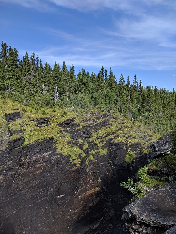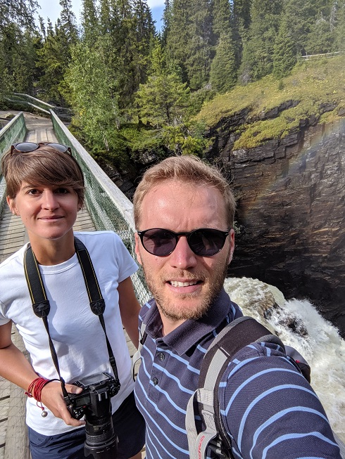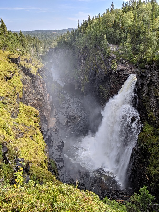 Nous faisons un premier arrêt aux cascades Hällingråfallet après un long bout de piste (30 kilomètres) depuis Bågede. Elles sont très puissantes et bruyantes du haut de leurs 43 mètres. Nous nous baladons des deux côtés de la gorge pour voir tous les points de vue.