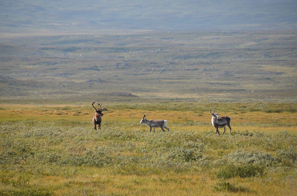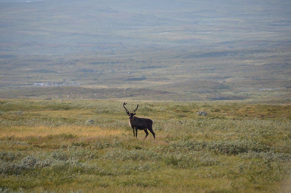Nous apercevons pour la première fois du séjour des rennes, dans leur milieu naturel. Nous les observons un moment plein d’émerveillement avant de redescendre au niveau des lacs.