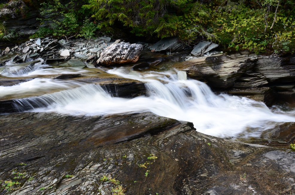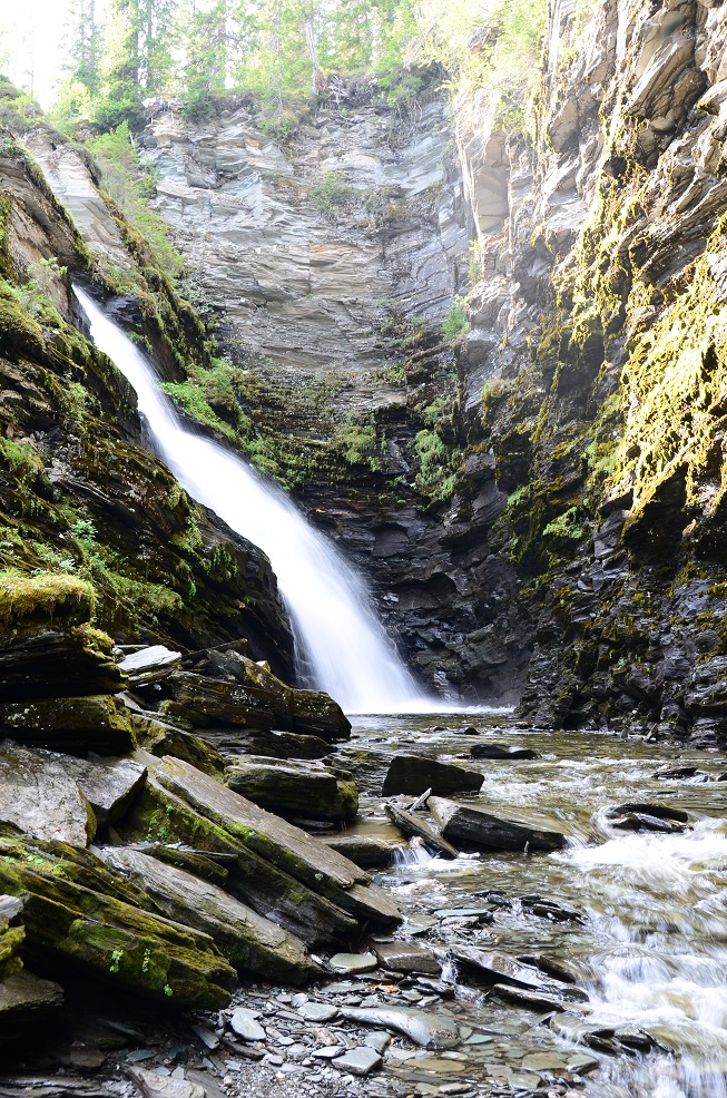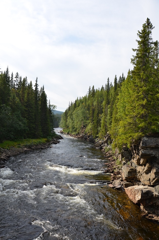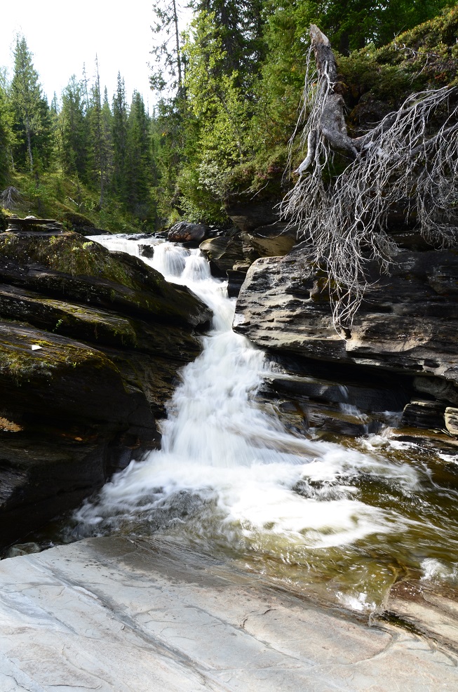 Nous repartons direction Gåddege puis Stora Blåjsön avec un arrêt aux Brakåfallet. Une première petite cascade forme ensuite une piscine naturelle. Puis, nous empruntons un sentier pour aller d’abord au-dessus de la grosse cascade, et ensuite dans la combe où elle chute. Très belle ambiance.