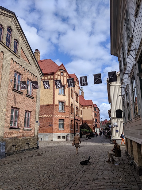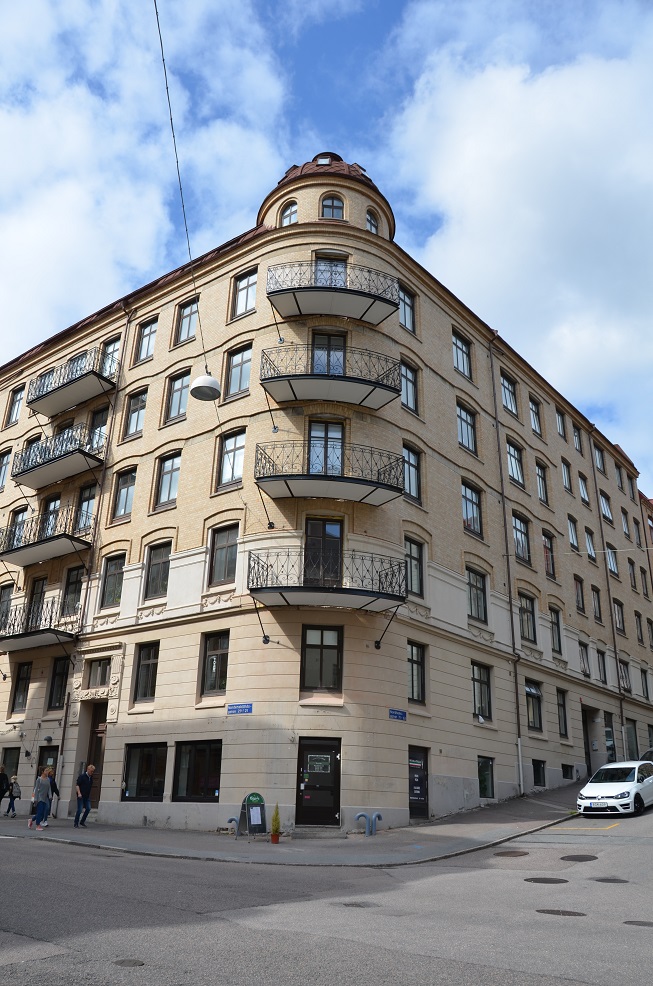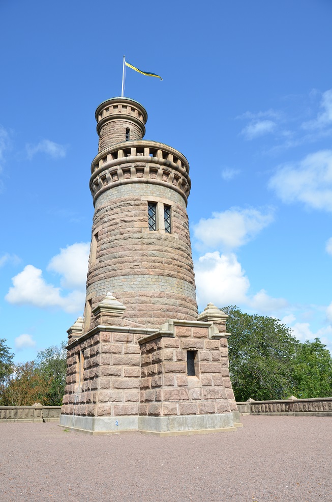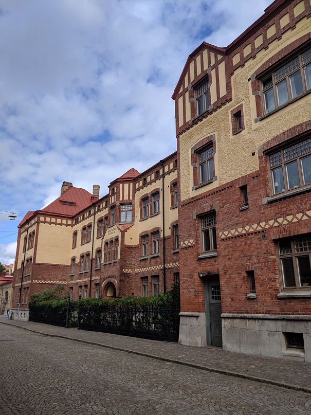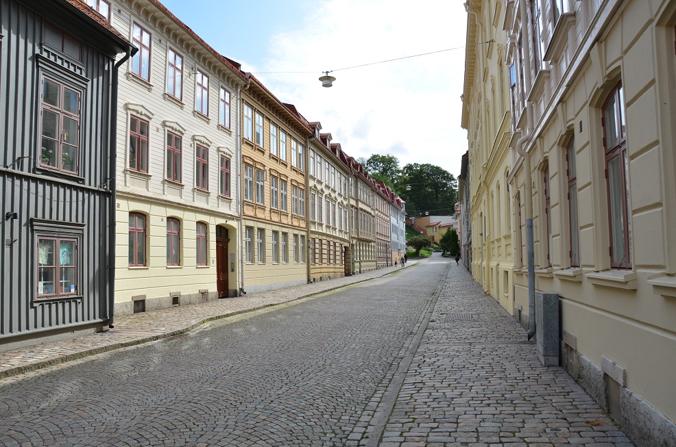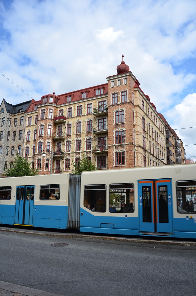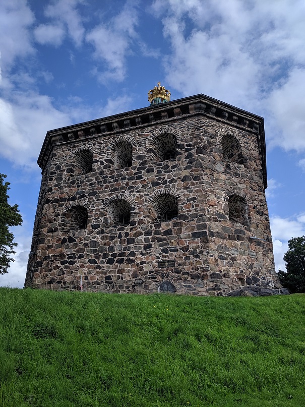 Avant de le visiter, nous allons jusqu’au Masthuggskyrkan, une église en hauteur puis jusqu’à la Stora Utsiken. Sans grand intérêt car sans point de vue. Nous rejoignons le quartier Linné depuis les hauteurs du parc Slottsskagen. Nous descendons et arrivons, via les différentes rues du quartier à la tour Skansen Kronan. Elle est très jolie et perchée sur un monticule offrant une très belle vue sur les toits de la ville.