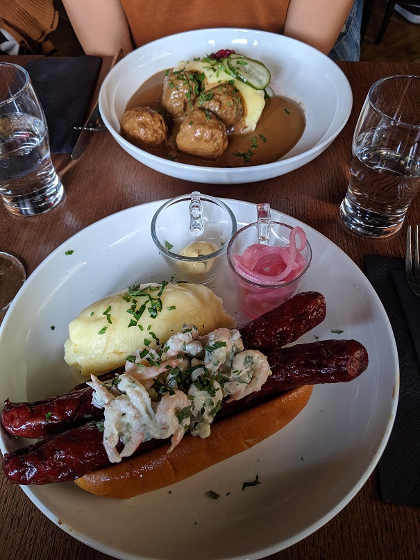 Il est ensuite temps d’aller au Hemma hos pour partager une planchette fromage / charcuterie et déguster des boulettes de viande aux airelles, et des saucisses avec une salade de crevettes. Le tout accompagné de bière et de vin.