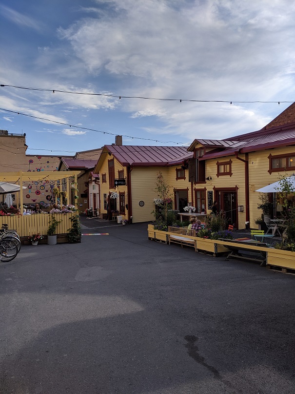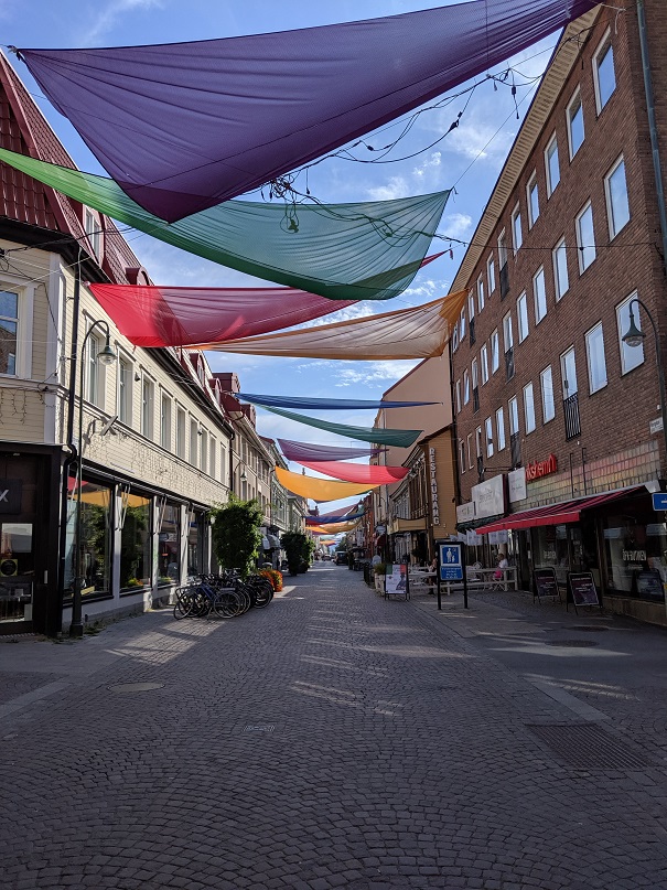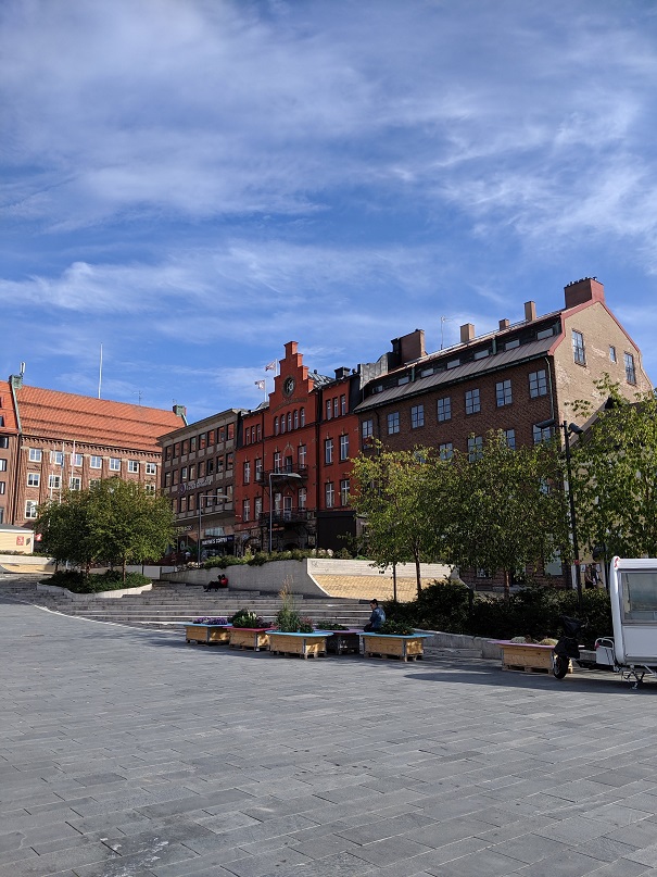 Il fait déjà beau et bon au soleil. Un petit déjeuner, une douche et nous nous posons un peu en attendant que nos affaires finissent d’être lavées. Nous démarrons en début d’après-midi pour rejoindre le centre à vélo. Nous mangeons un petit bout au café Wedermarks Konditori Bageri : un wrap au saumon, un sandwich cake et de bonnes pâtisseries. Maxime prend un kanelbullar pour le chemin, qui était d’ailleurs très bon.