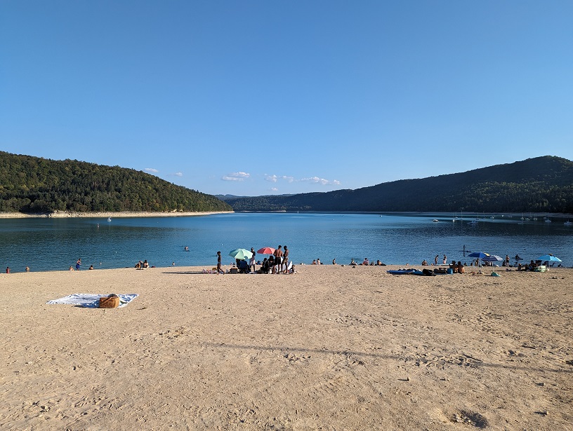 On pousse jusqu’à la cascade des Tuffs mais elle est complètement sèche. On est confrontée à la réalité du climat. C’est l’heure de redémarrer. Sur le retour, arrêt à l’épicerie de Point-de-Poitte puis une baignade rafraîchissante à Bellecin.