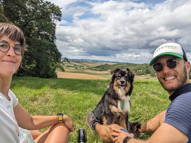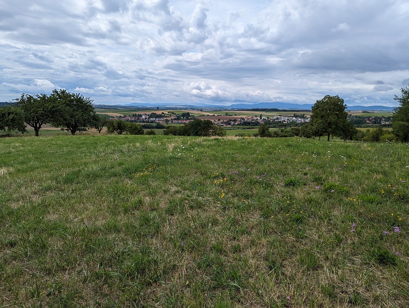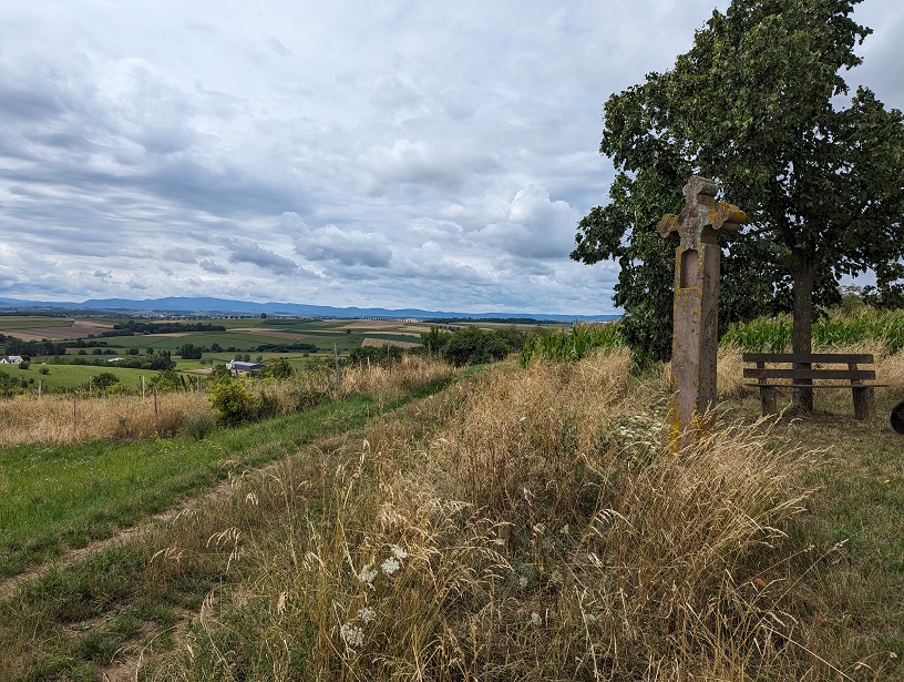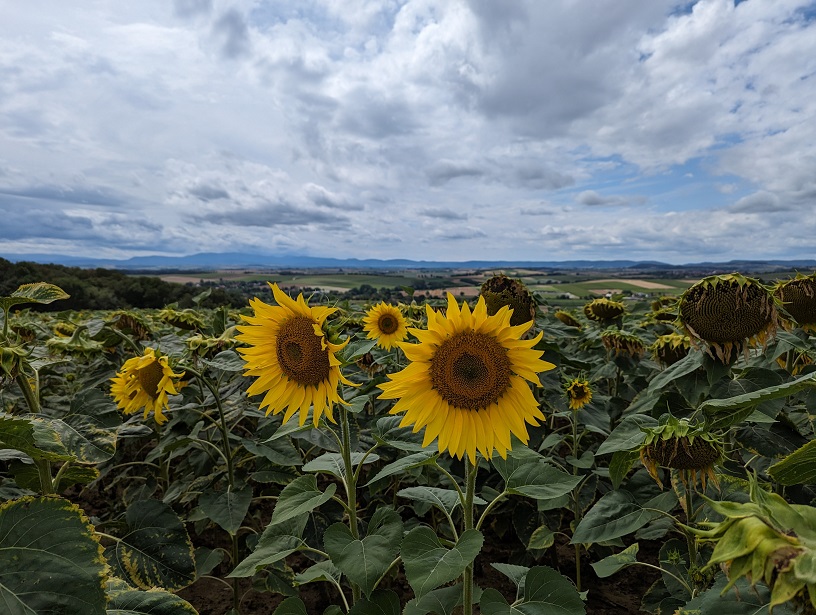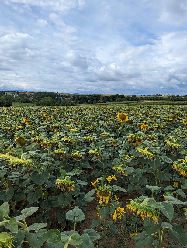 La balade débute en longeant la voie ferrée pour nous amener dans les champs. Les tournesols sont en fleur, la vue sur la plaine du Kochersberg est très jolie et nous en profitons le temps d’un pique-nique.