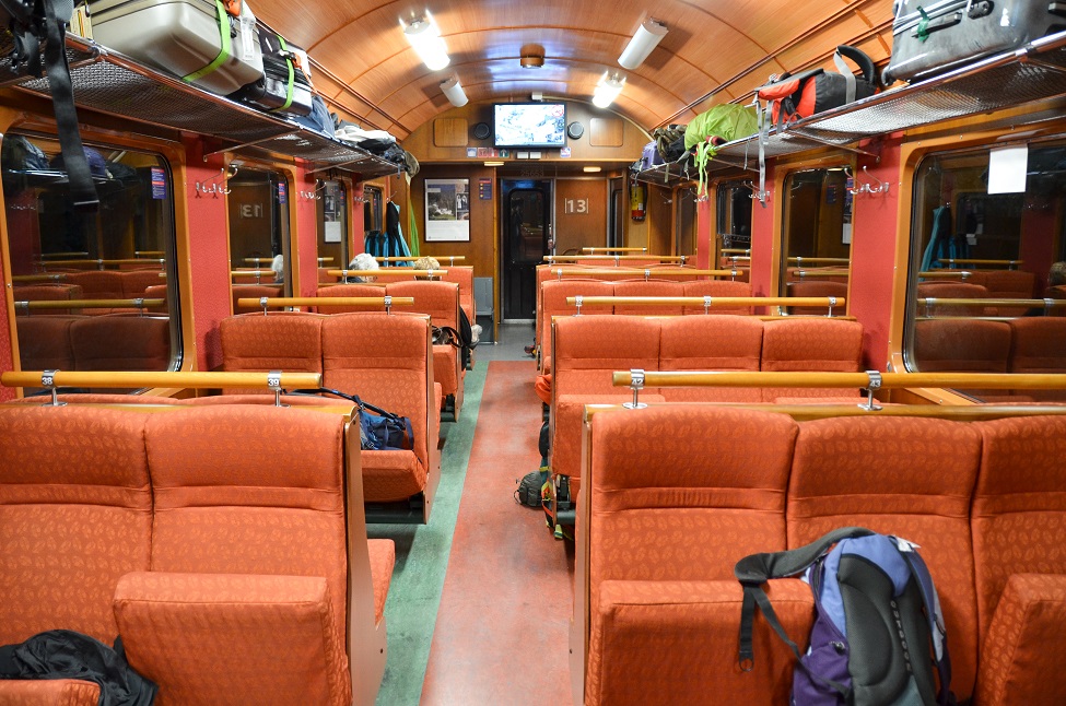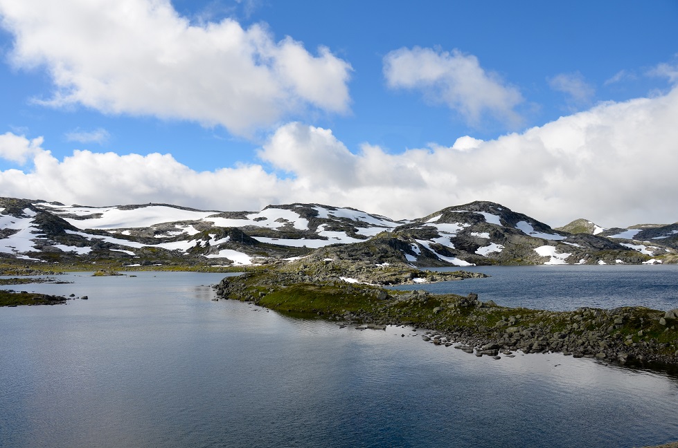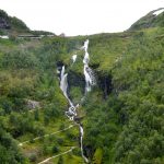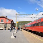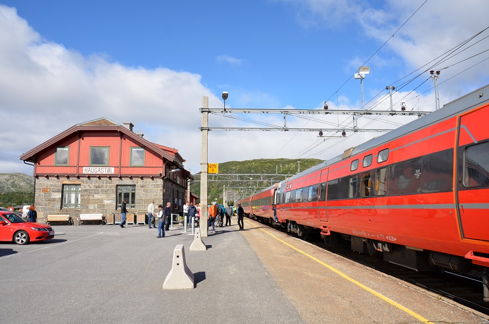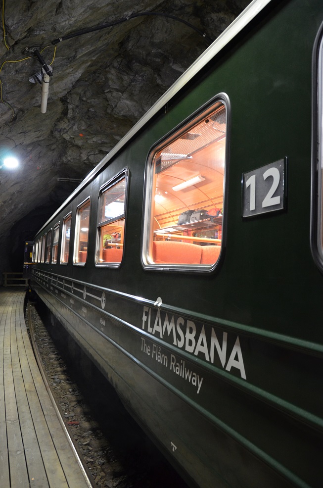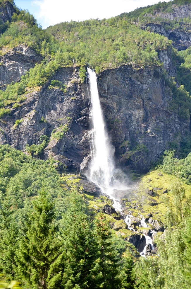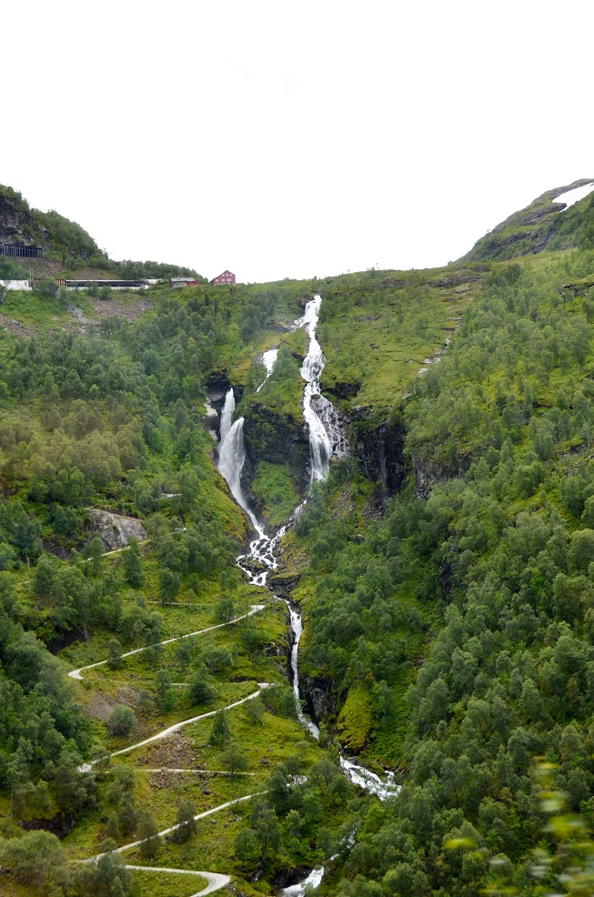 Levés aux aurores, le train part à 6h25 quai 3 à la gare centrale d’Oslo. Le train démarre avec ponctualité sous un ciel chargé de nuages et une pluie soutenue. Les premiers paysages ne sont pas transcendants alors on en profite pour finir la nuit. Après trois heures de voyage (sur les cinq prévues), on en prend plein les yeux : neige, montagnes et lacs se succèdent. Le train fait des pauses souvent dans les différentes gares.Arrivés à Myrdal où l’on pensait voir une gare d’une certaine taille, on passe de l’autre côté du quai pour monter dans le Flåmsbana composé de nombreux wagons au style impérial réservés aux croisiéristes. Nous serons dans le wagon de queue n°11 avec un siège côté fenêtre. Le train descend jusqu’à Flåm sur 20km en s’arrêtant à une immense cascade. Il serpente doucement le long de la vallée. A Flåm, beaucoup de touristes et de magasins qui vont avec. On prend un thé en attendant le bâteau express.