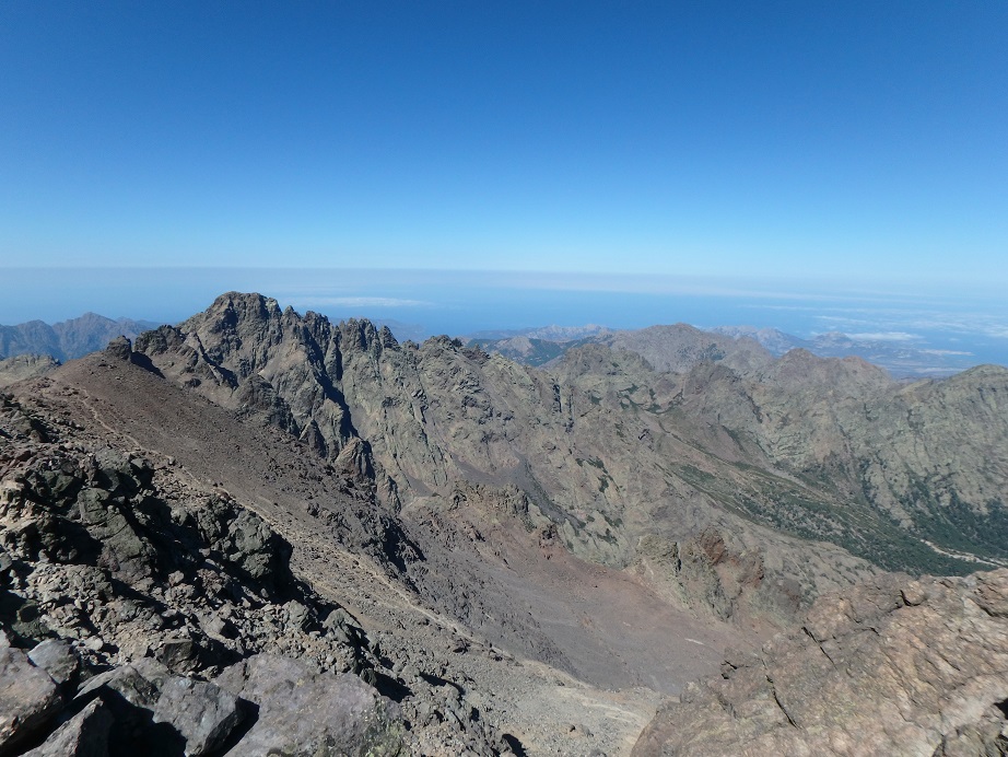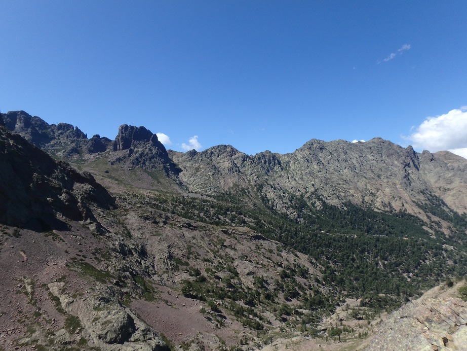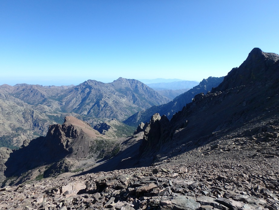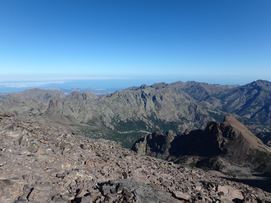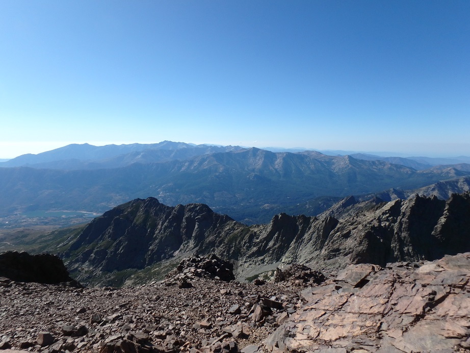 Longue montée pour arriver à la pointe des Eboulis (2651 m). La montée est dure, surtout mentalement. On dépose les sacs à la pointe pour gravir le Monte Cinto (2706 m). On fait demi-tour à l’antécime ouest (2651 m) car mes muscles se tétanisent à cause de la peur. Nous retournons sur la pointe pour pique-niquer. Nous décidons de redescendre au point de départ, la boucle prévue initialement étant compromise par la fermeture du cirque de la Solitude. Retour à Haut-Asco où nous prenons un verre à l’hôtel restaurant Au Châlet puis direction le camping Monte Cinto. On range les affaires de trek et on intalle le campement avant d’aller prendre une douche bien méritée. Nous profitons du restaurant du camping pour dîner.