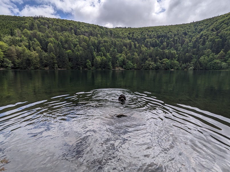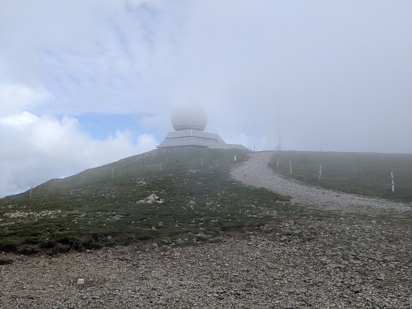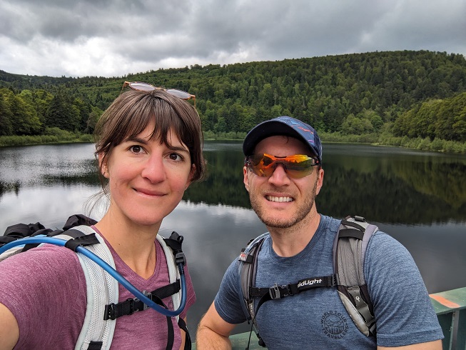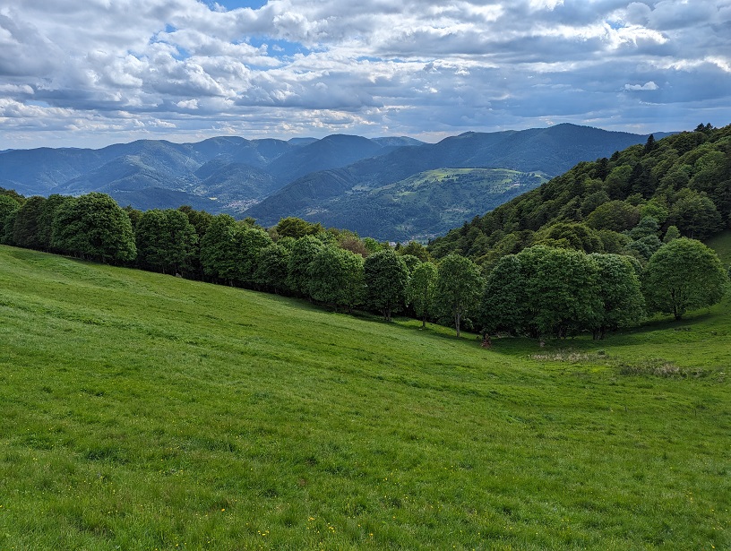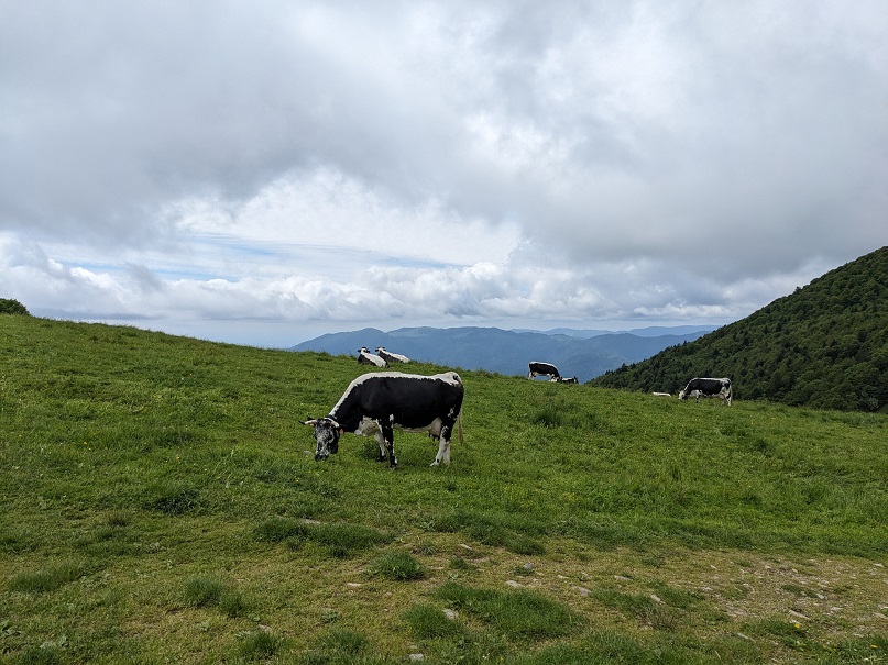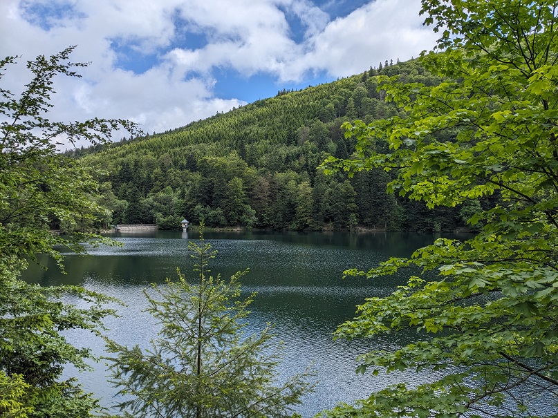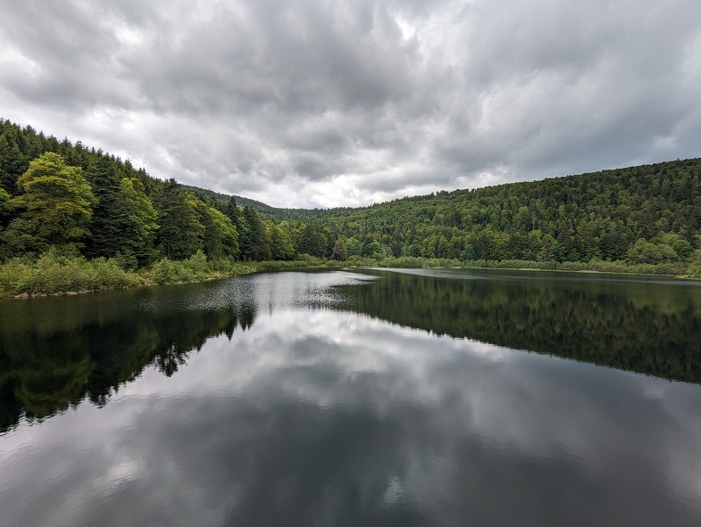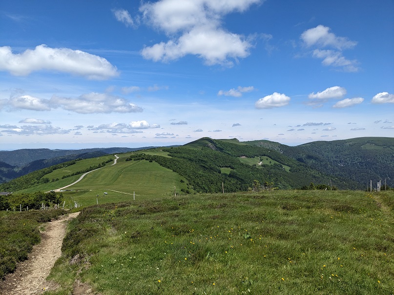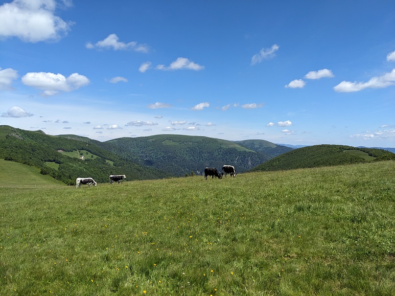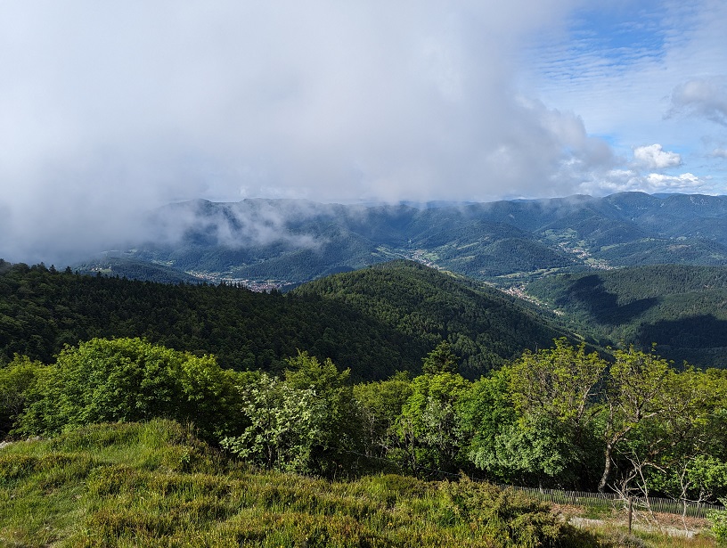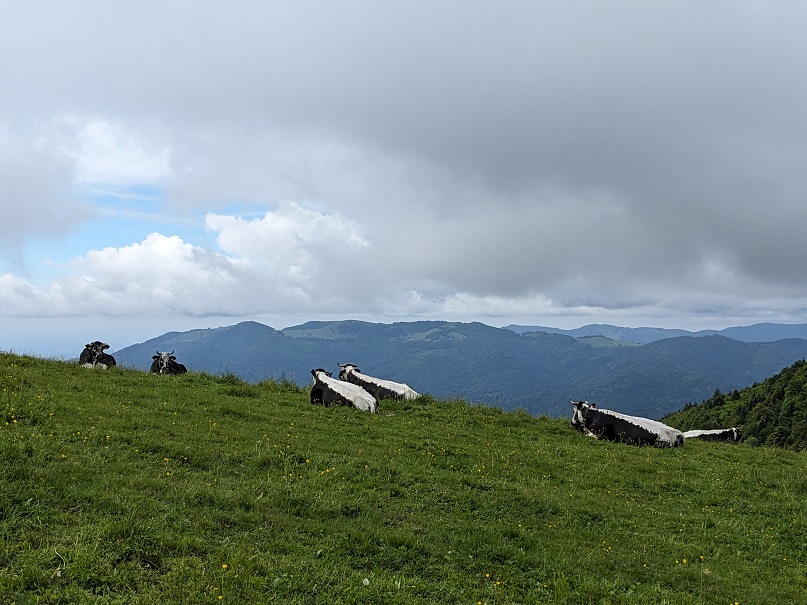 Après une nuit au chaud, nous nous réveillons dans le brouillard vosgien. On prend un bon petit déjeuner, et on repart pour notre deuxième journée, objectif Grand Ballon. La montée se fait dans le brouillard mais assez rapidement, nous apercevons quelques minuscules trouées bleues dans le ciel. Le sommet tient ses promesses : beaucoup de vent, du brouillard. Le vent a un avantage, pousser les nuages. Le ciel se dégage et nous pouvons profiter du point de vue avant de redescendre direction le lac du Ballon puis le lac de la Lauch. Une dernière montée et nous sommes de retour au Markstein. Et parce qu’on a envie d’un bon repas chaud, nous déjeunons à la ferme auberge du Markstein qui nous accepte malgré l’heure tardive.