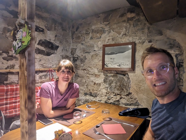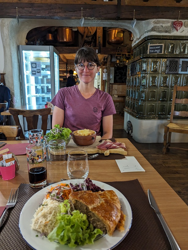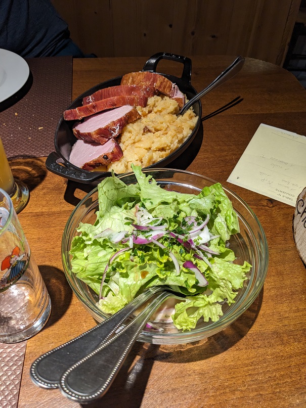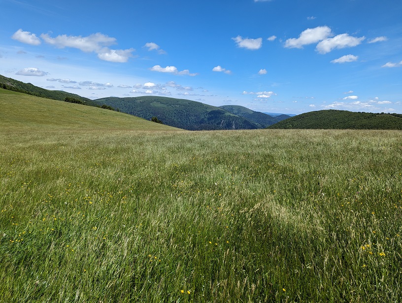 Nous sommes partis du Markstein sous un beau soleil (merci le vent qui pousse les nuages) direction le col du Hanhenbrunnen puis le col du Herrenberg en passant par Schweiselwasen. Vues à 360°, plein air, on en prend plein les yeux. On pousse jusqu’au col du Rothenbach qui marque la moitié du parcours. Après être repassés par le col du Herrenberg, on continue la randonnée en profitant d’un point de vue sur le lac de Kruth-Wildenstein. Puis direction le Treh, en passant devant la ferme auberge du même nom et retour au point de départ. De retour au Markstein, nous cherchons un endroit pour poser la tente. Le vent ne nous a pas quittés de la journée et les températures annoncées pour la nuit nous font nous questionner : une prévision de 2° avec un ressenti négatif à cause du vent et de l’humidité. Le verdict tombe : nous dormirons dans le van et testerons la tente ultra légère 3 personnes une autre fois. Pour nous réchauffer et prendre des forces, direction la ferme auberge du Markstein pour un délicieux repas avant une nuit de repos.