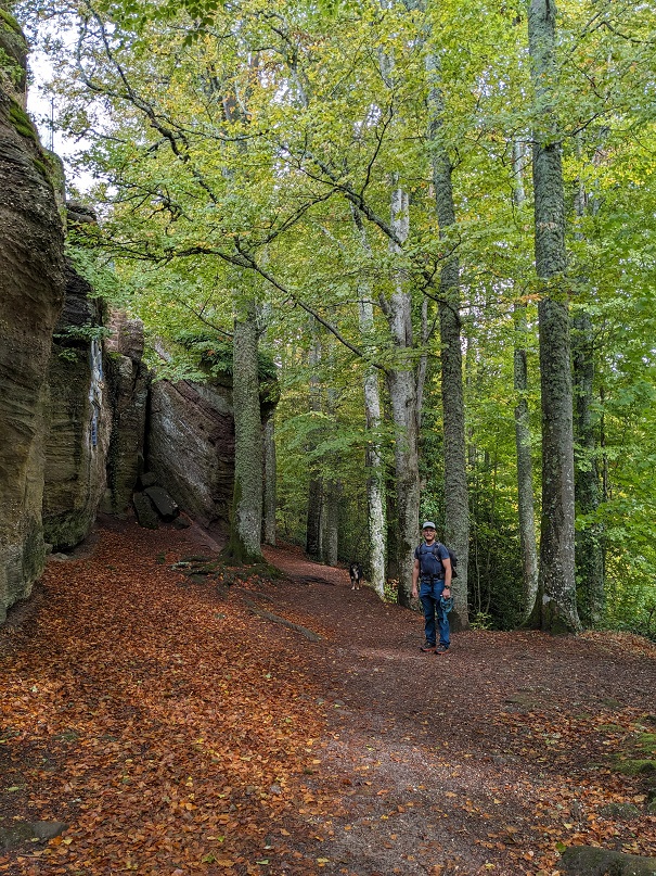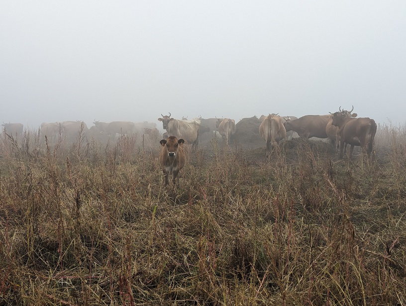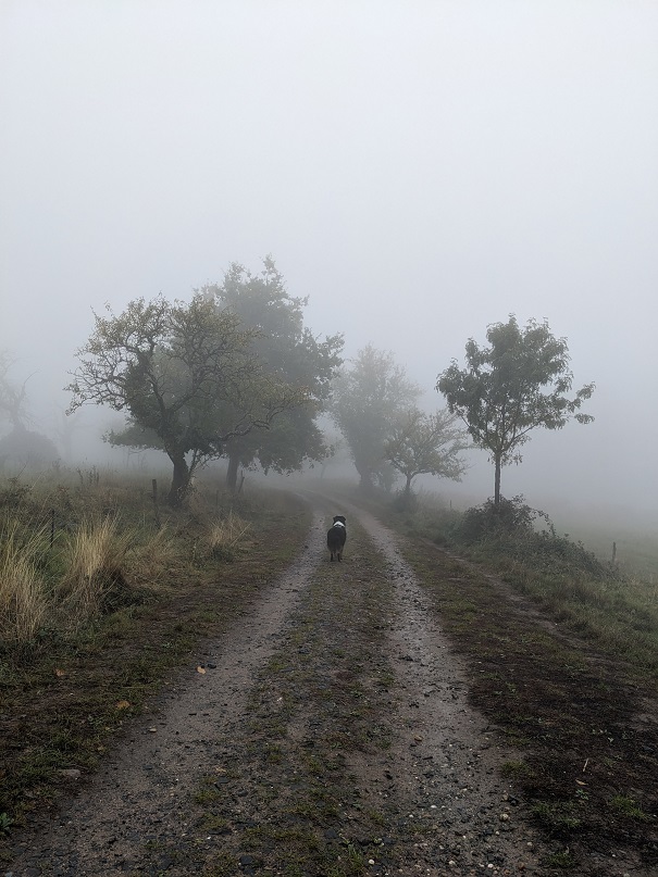 La première était une superbe paire de chaussures de randonnée. La deuxième est le départ vers Barr pour faire une randonnée en amoureux. Le temps est conforme à l’automne et offre une ambiance feutrée. Nous devinons les vaches au dernier moment sur le chemin menant à Truttenhausen.