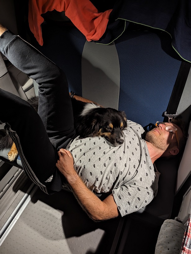 De retour au camping, pause gourmande au snack avec deux belles coupes de glace. Puis Maxime part nager et je le suis en paddle avec Thor dessus. On fait une pause baignade avant de retourner sur la plage. Une bonne douche et c’est déjà l’heure de dîner. On ne se fait pas prier pour aller se coucher !