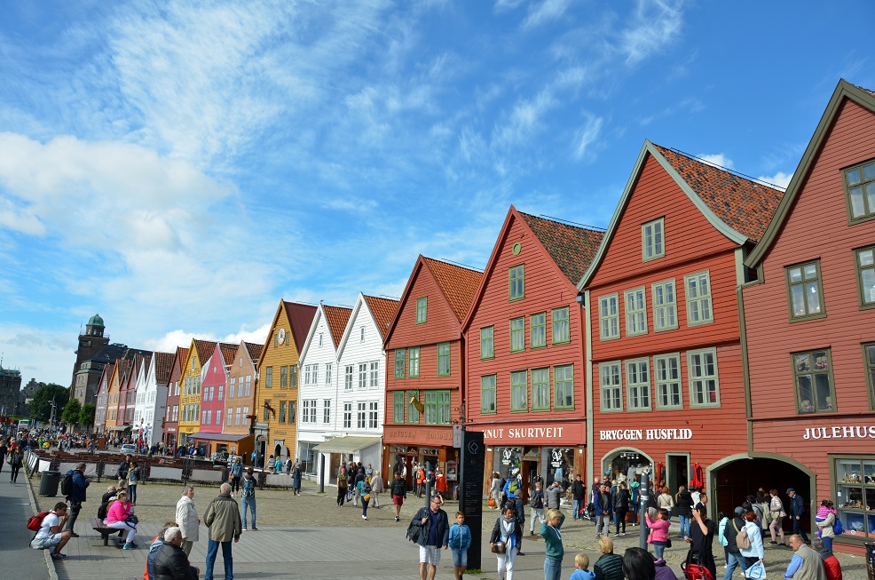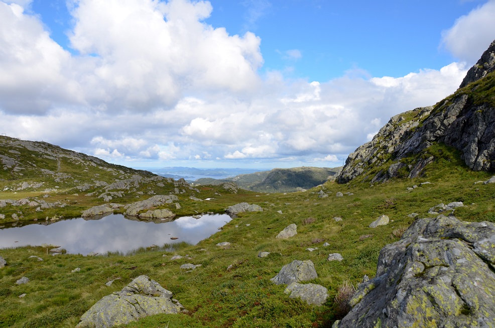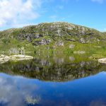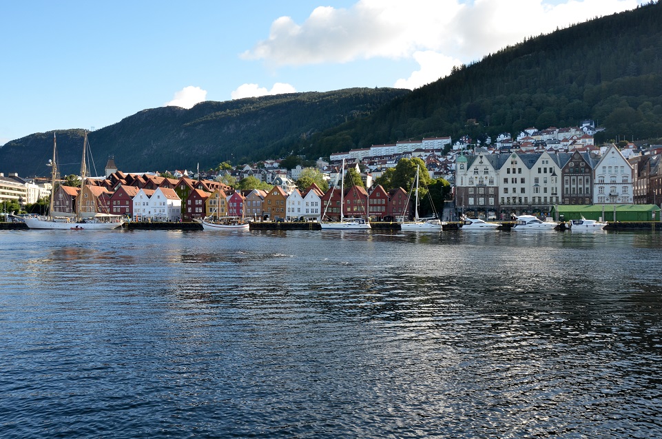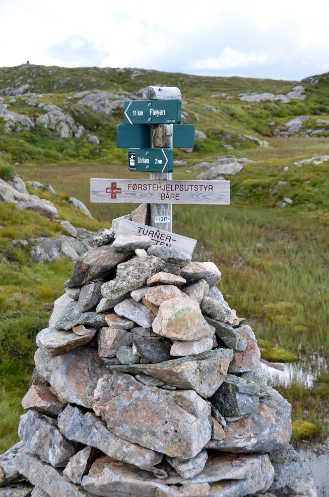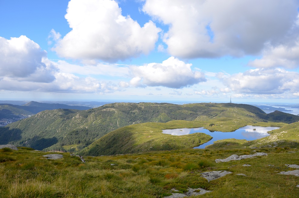Levés à 8h et petit déjeuner pour partir à 9h, photo devant le port avec un beau soleil. Ensuite, direction Ulriken où il y a un télephérique. Nous préférons monter à pied cette pente abrupte. Heureusement qu’il y avait une section plane en guise d’échauffement avant cette première ascension.La vue sur Bergen et ses environs est magnifique entre collines, eaux et forêt. Nous arrivons sur un plateau parsemé de lacs que nous parcourerons d’Ulriken à Fløyen. Nous sommes entre 650 et 500 m au dessus la mer, le sentier est technique et humide. Nous parcourons 23km avec 1200m de D+ en 5h30. Arrivée dans Bryggen et visite des maisons colorées, c’est vraiment sympa même s’il y a beaucoup de touristes. On va prendre un coup en terrasse devant les maisons puis un bon goûter avec glaces au 7 eleven et cookies du Deli de Lucas. Enfin, on fait un tour à Rema 1000 pour acheter des légumes qui accompagneront le poisson acheté au Torget i Bergen.