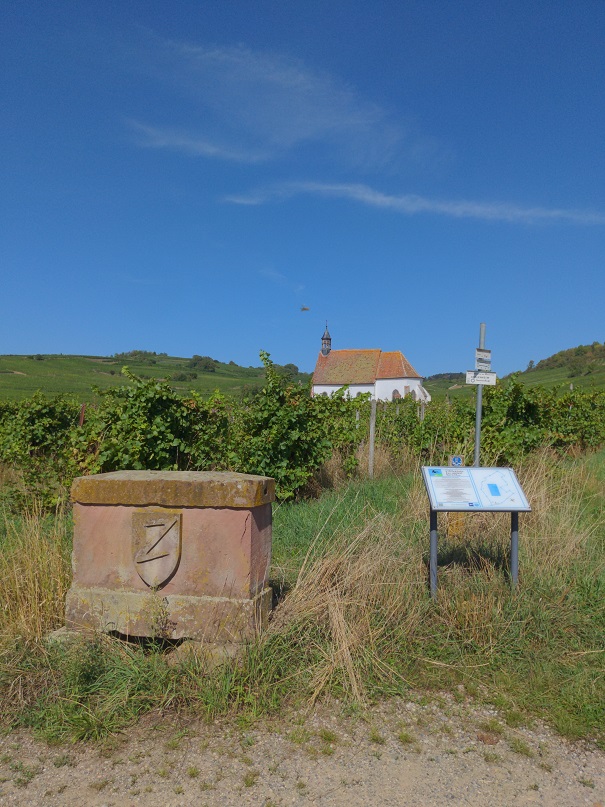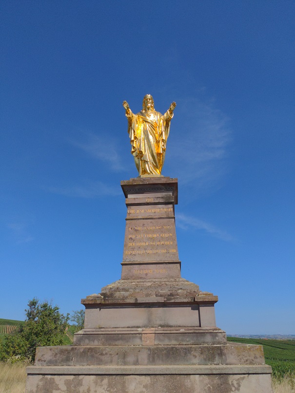 Nous rejoignons ensuite la passe à poissons puis les champs à l’entrée de Wolxheim. Nous passons devant la chapelle Saint-Ulrich et grimpons jusqu’au Sacré Cœur de Wolxheim.