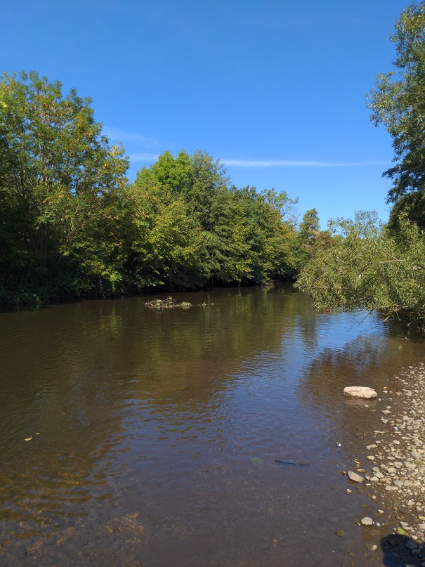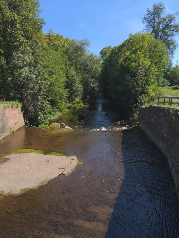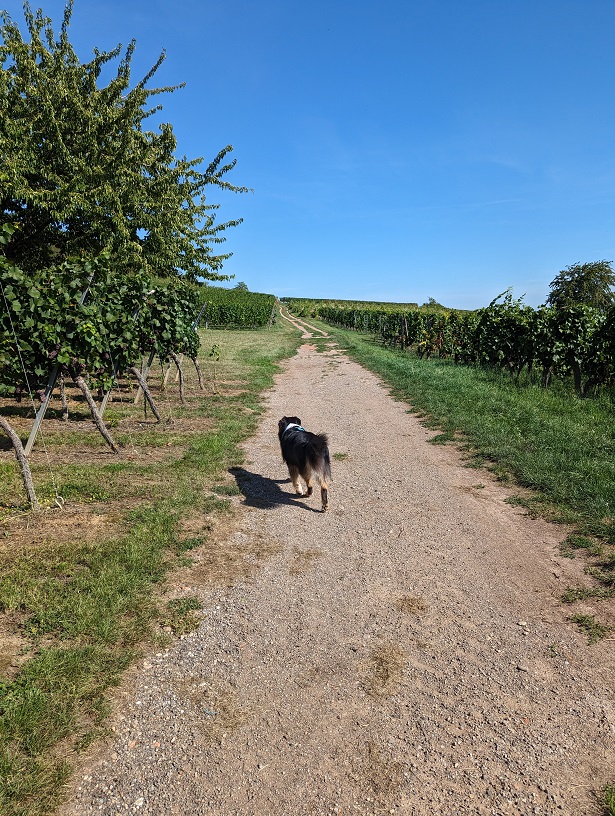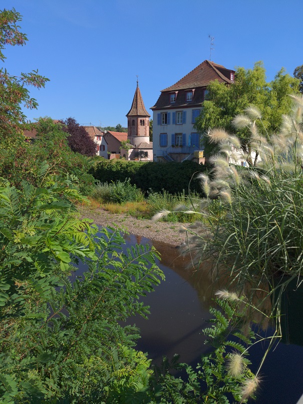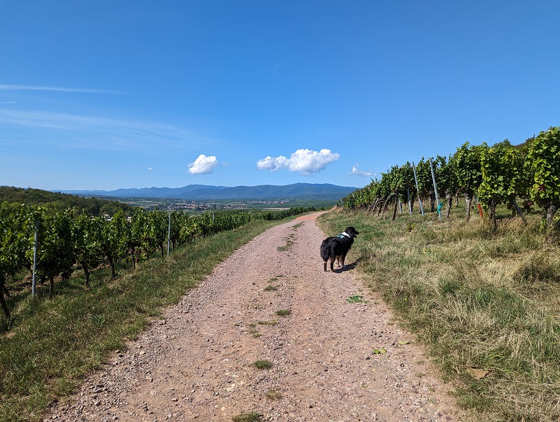 La randonnée débute en passant par les champs avant de rejoindre Avolsheim. Au niveau de la chapelle Saint-Ulrich, nous descendons le long de la Bruche pour que Thor puisse se rafraîchir.
