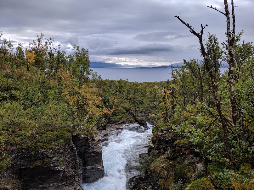 Nous redescendons direction Abisko et passons devant l’Aurora Sky Station (ouverte les nuits d’hiver pour admirer les aurores boréales), puis sous un téléphérique et arrivons à une cascade splendide à côté de laquelle nous pique-niquons.