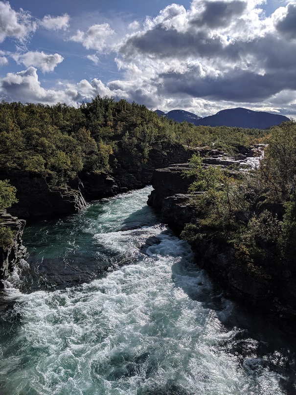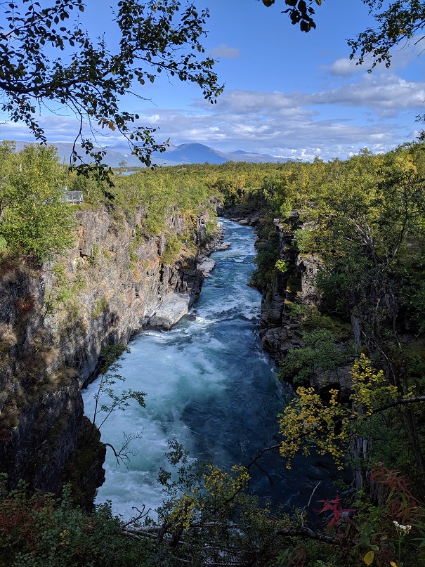 Nous finissons ensuite la descente jusqu’à Abisko et passons devant des rapides turquoise dans l’Aberskoeatnu et le début du chemin de randonnée Kungdsleden. Nous revenons au camping par un sentier le long de l’eau. Les derniers kilomètres sont un peu longs car il n’y a plus de point de vue.