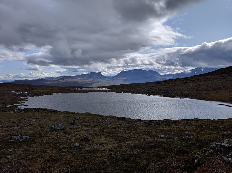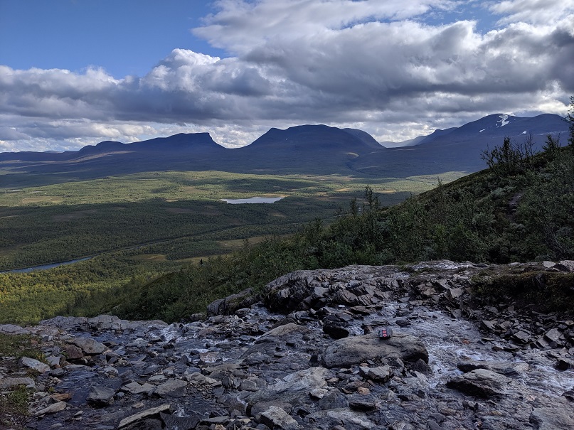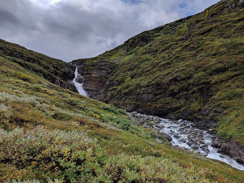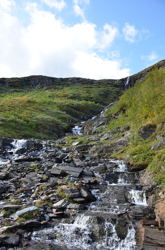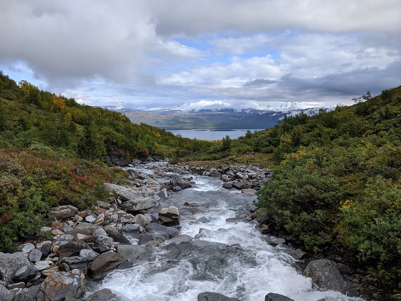 Nous enlevons également les polaires car la montée nous réchauffe ! Nous nous dirigeons le long du torrent vers le col entre Njullá et Slåttatjåkka. Nous quittons vite la forêt de bouleau, ce qui nous permet d’avoir une magnifique vue (torrent, rapides, glaciers).