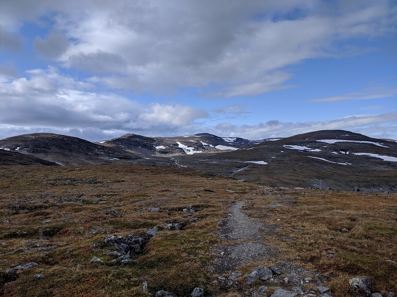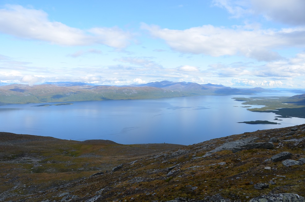 Arrivés au col, nous bifurquons ers le sommet Njullá (1169 m) qui nous permet d’admirer le parc national d’Abisko avec une vue à 360°. C’est magnifique mais extrêmement venteux et froid.