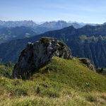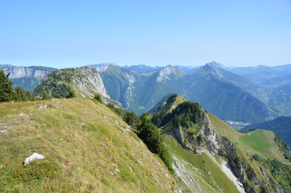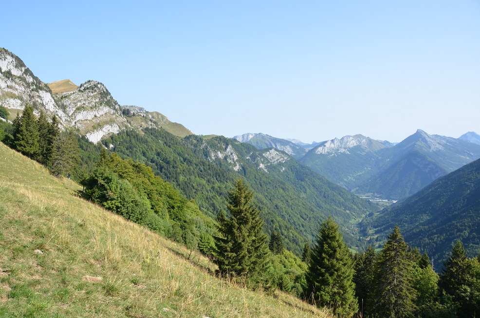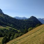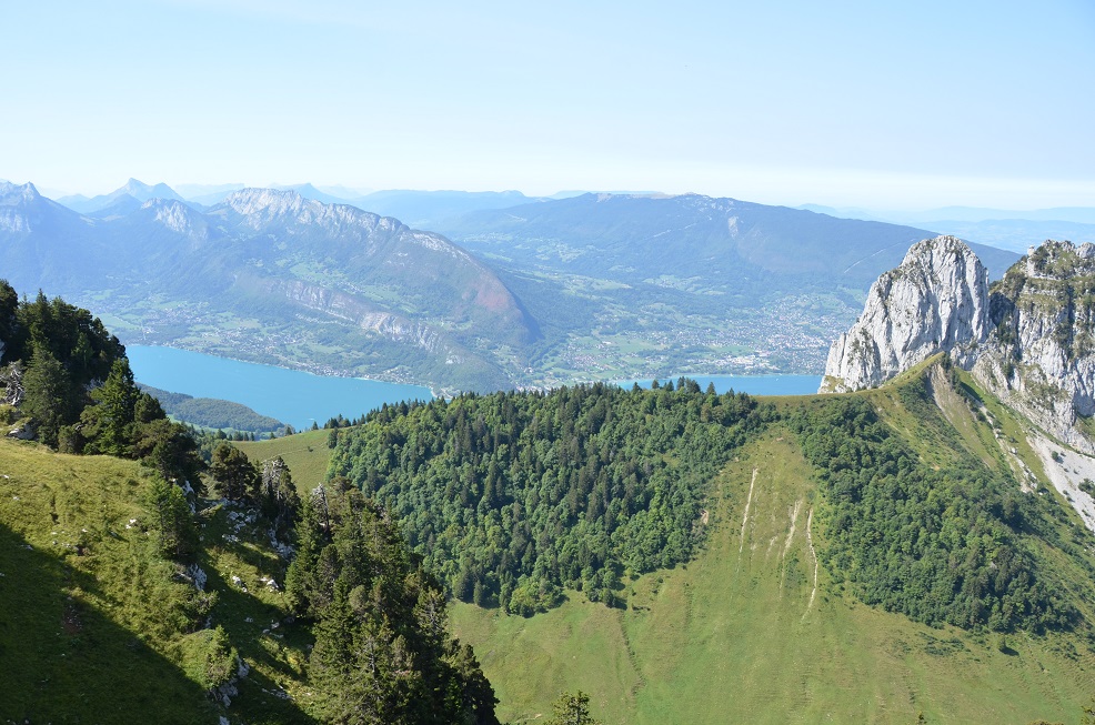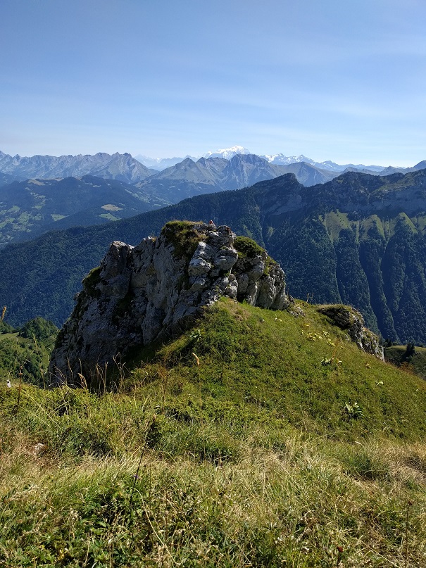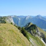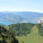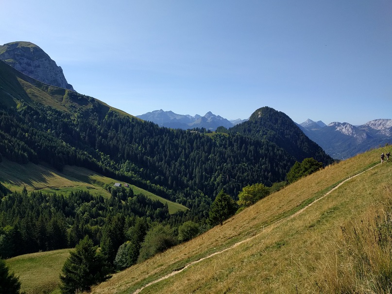 On monte au col des Nantets avec un bon rythme (600 m de d+ en une heure), puis passons par le pas de l’Aulp qui est un peu aérien. On longe ensuite quelques chalets avant d’entamer la dernière montée jusqu’à la point de Talamarche. On mange avec la vue sur les Aravis et le Mont-Blanc, le panorama est magnifique. Après une belle pause, nous redémarrons et entamons la descente qui sera longue et cassante. Elle débute dans les alpages, passe à côté des chalets de Laurieux et termine dans la forêt.