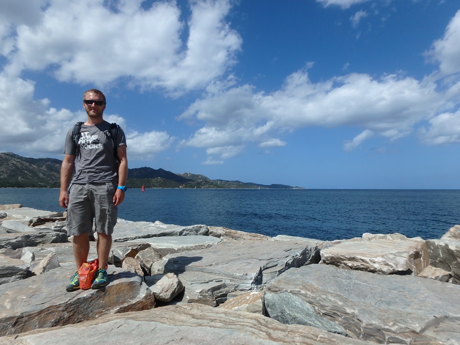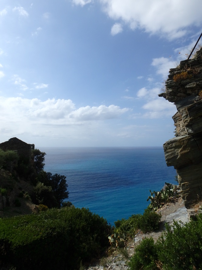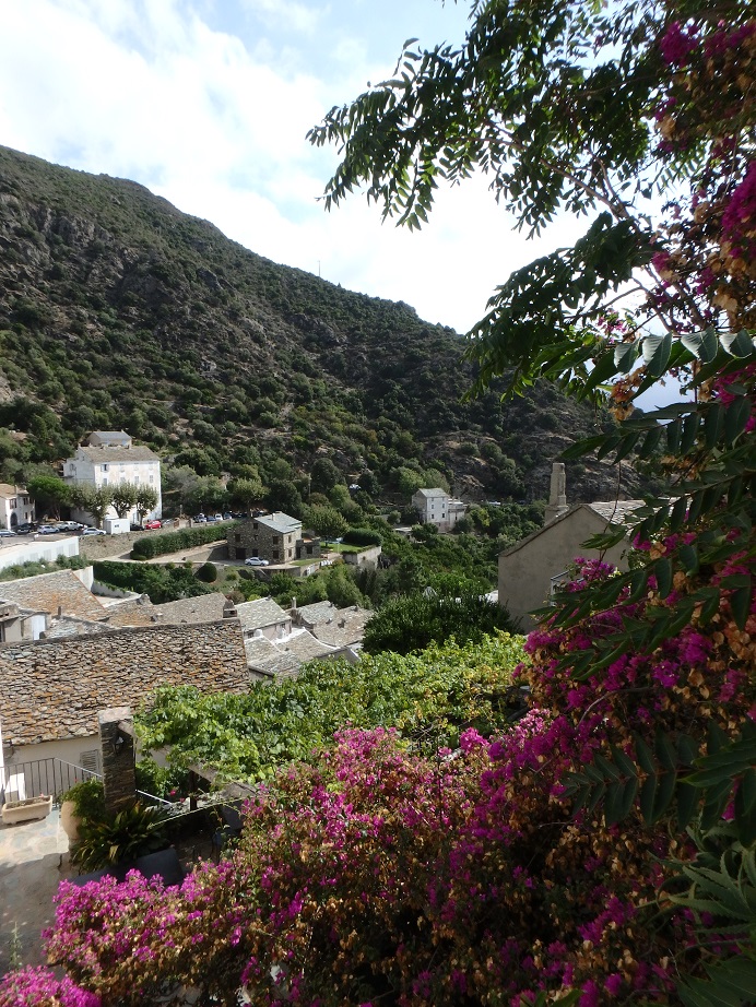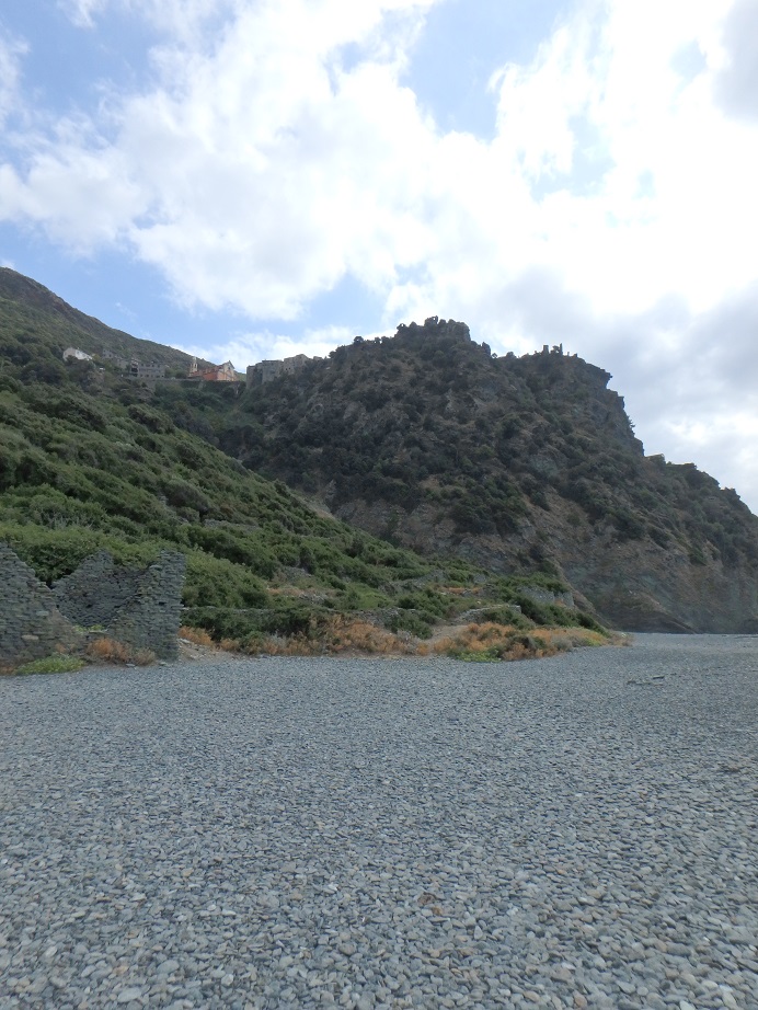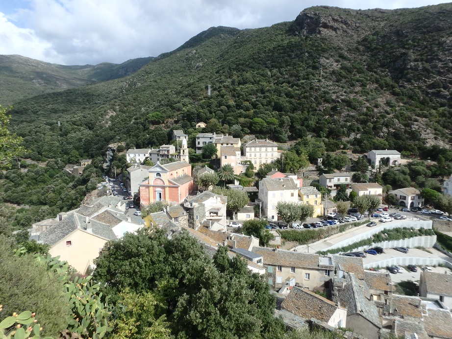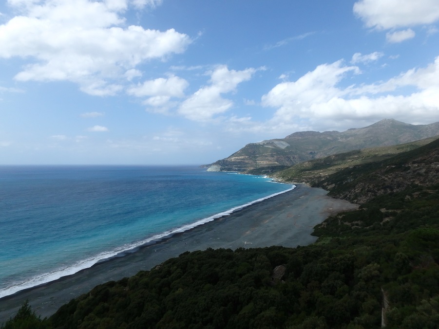 Installation au camping d’Olzo. Direction Nonza pour descendre jusqu’à la plage de galets noirs et monter jusqu’à la tour gênoise. Petit verre sur la place du village. Retour au camping sous le soleil et douche qui réchauffe.