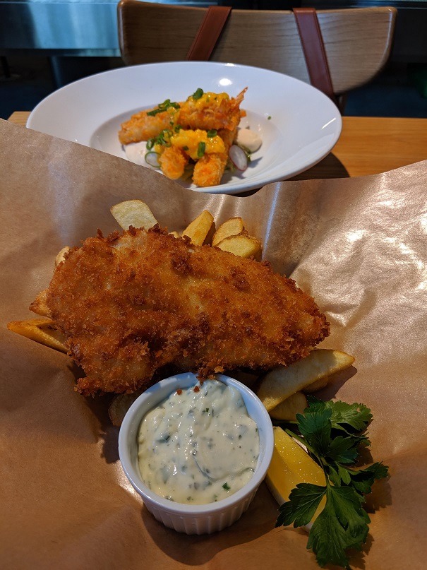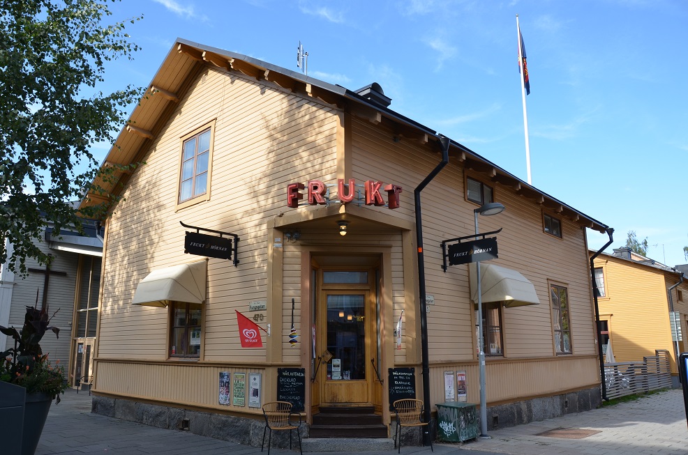 Nous nous posons sur un quai de la Umeälven, les suédois sortent de leur bureaux et viennent manger au bord de l’eau pour profiter du soleil radieux. Nous poursuivons la balade avant d’aller déjeuner au Två Fiskare une poissonnerie qui propose des plats frais et les sert en salle. C’est délicieux : fish and chips pour Maxime, tempura de crevettes pour moi.