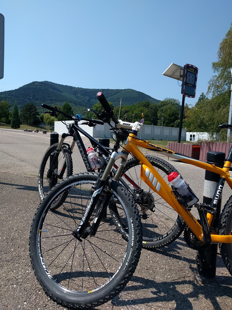 Ce week-end, sortie des VTT. Pour cette reprise, limite première, nous choisissons un parcours roulant, que nous connaissons bien pour l’avoir découvert en trail : le parcours du semi des courses des châteaux. Le départ se fait à Ottrott, le point culminant est le Mont Saint-Odile.